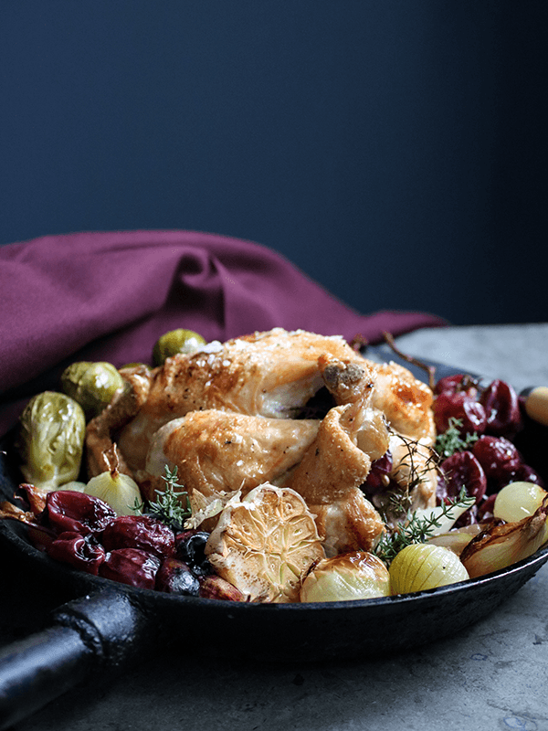 En varm och mustig rätt där helstekt kyckling tillagas med lök och serveras med rostad brysselkål och sötsyrliga vindruvor. En harmonisk kombination av sälta, sötma och rostade toner.